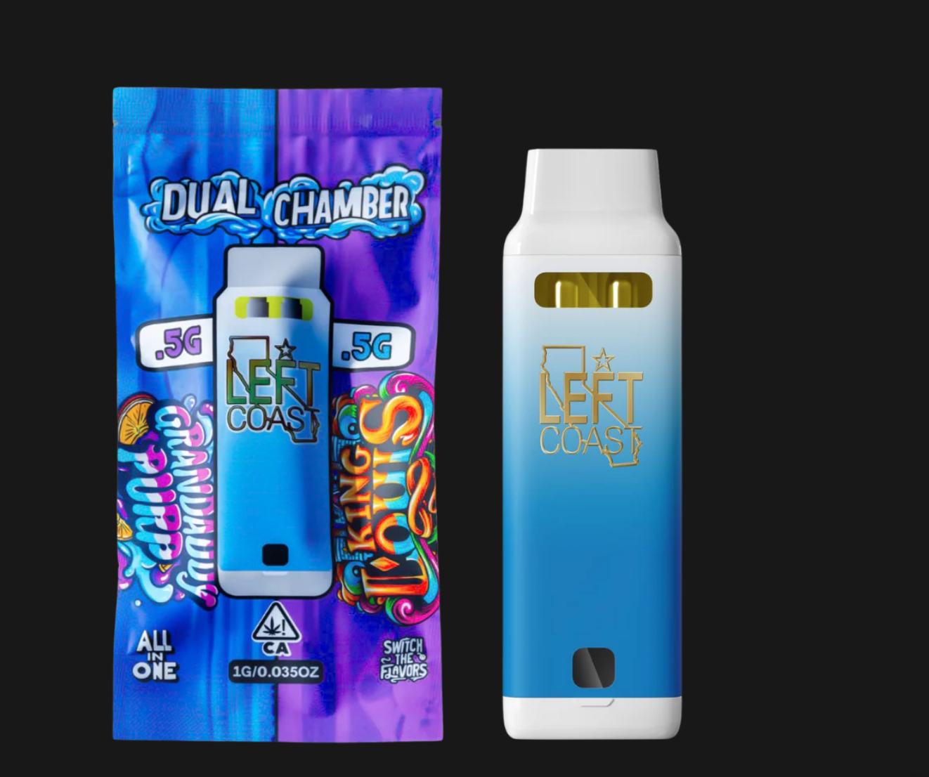 Switch the flavors. Left Coast's Dual Chamber Vape Pen features two tanks of high-quality, strain-specific oil in one pen, allowing you to effortlessly switch hits with a simple click, aligning your terpene experience with your mood.
